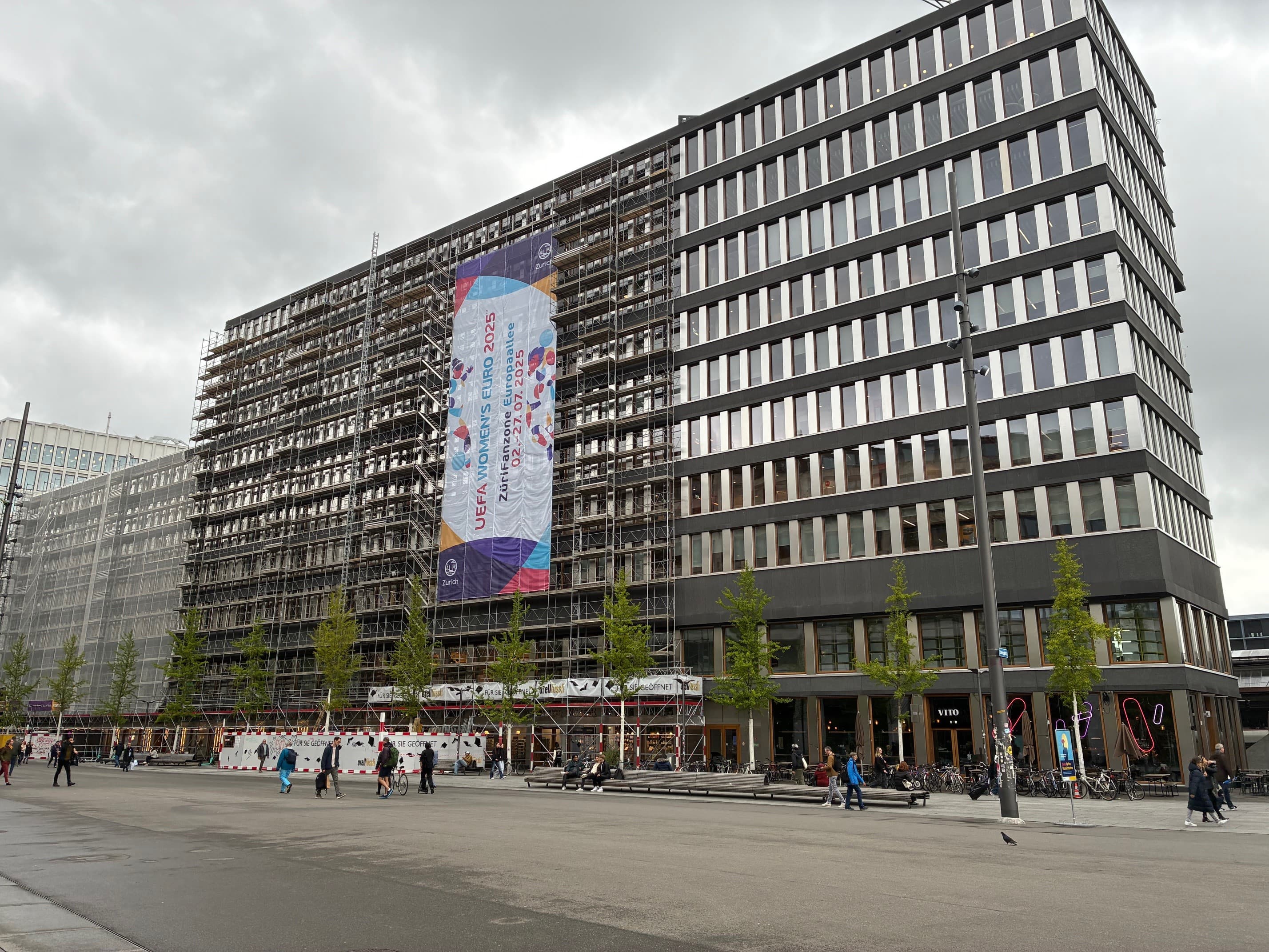 In der Europaallee, in unmittelbarer Nähe des hochfrequentierten Europaplatzes, läutet ein grosses Banner den Countdown zum diesjährigen Fussballsommer in Zürich ein.